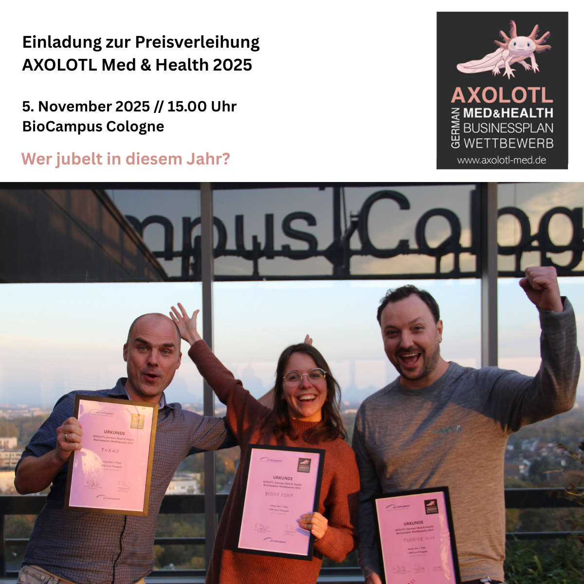 Herzliche Einladung zur Preisverleihung des AXOLOTL Med & Health Businessplan Wettbewerb 2025. Gefreut werden darf sich auf die diesjährige TOP TEN, die Bekanntgabe der der Gewinner*innen, inspirierende Impulse, tolle Gäste und exzellente Netzwerkmöglichkeiten.