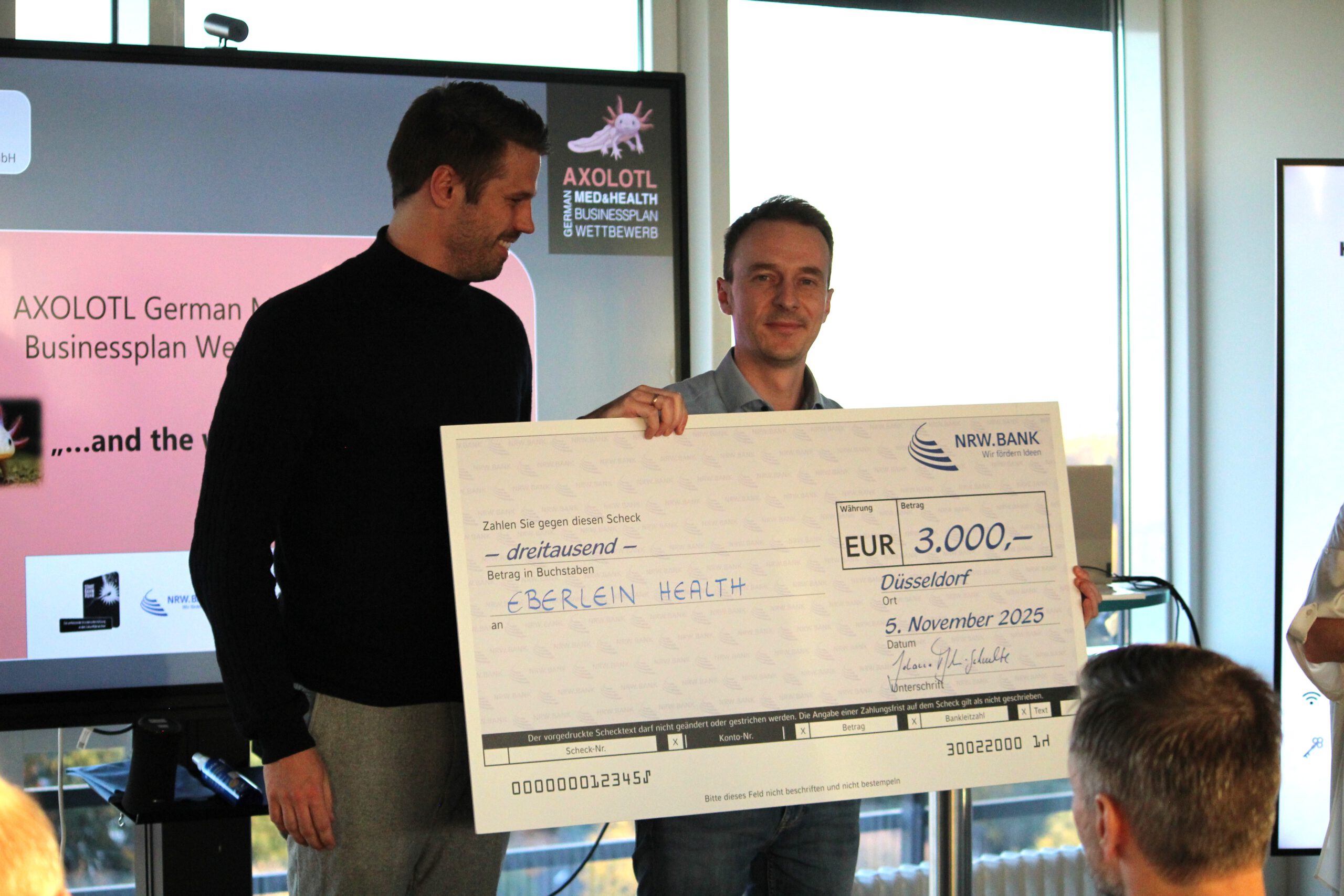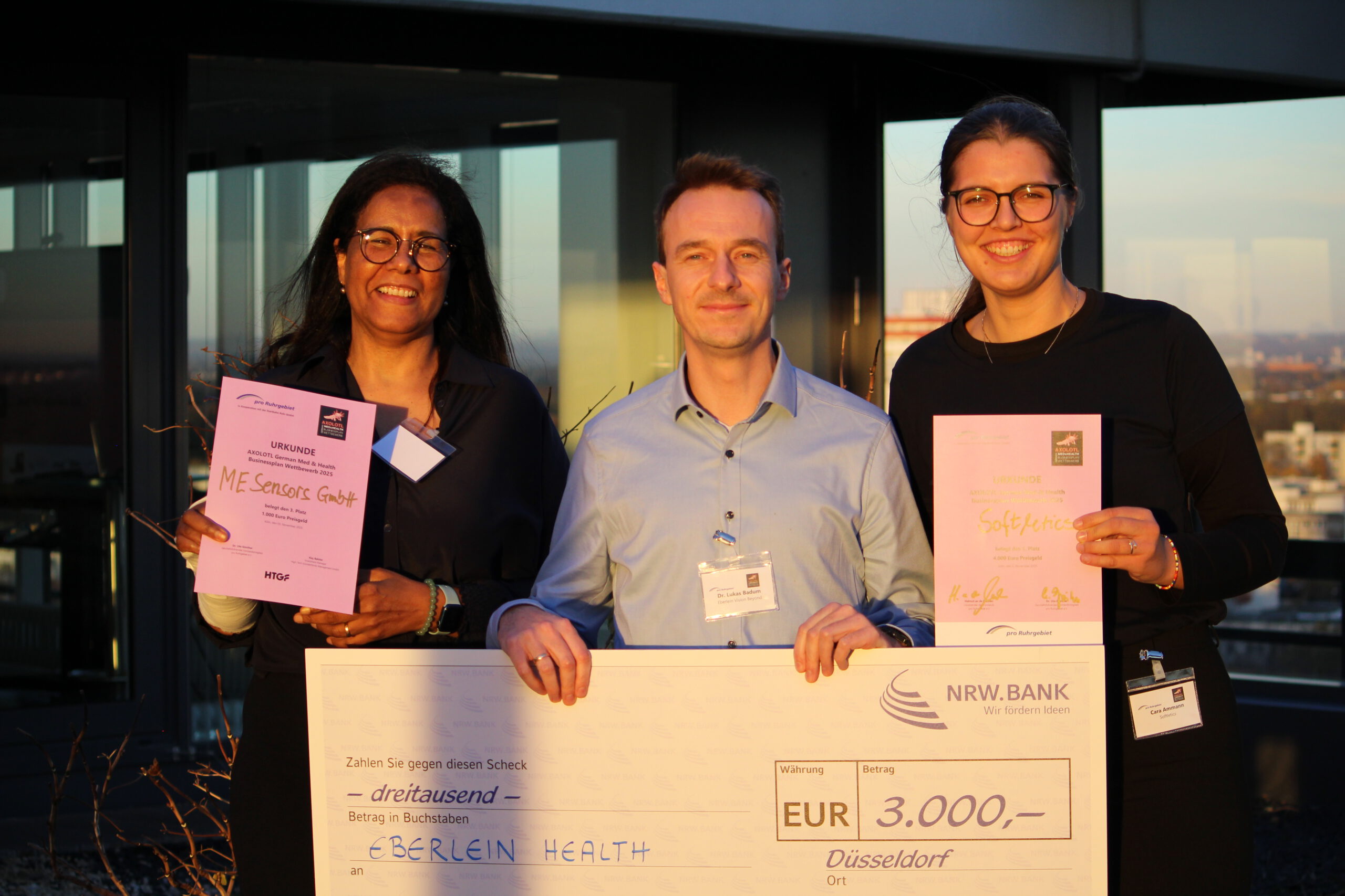 Platz 2 des Wettbewerbs ging an Dr. Lukas Badum und sein Team von Eberlein Health (Forchheim) (https://www.eberlein-health.com/). Das Start-up hat ein digitales Augendruckmessgerät für Glaukompatienten entwickelt – bezahlbar, zu Hause anwendbar und ergänzt durch intelligentes Monitoring. Den zweiten Platz lobte die NRW.Bank aus. Investment Manager Jonas Vonnahme überreichte den Scheck im Wert von 3.000 Euro.