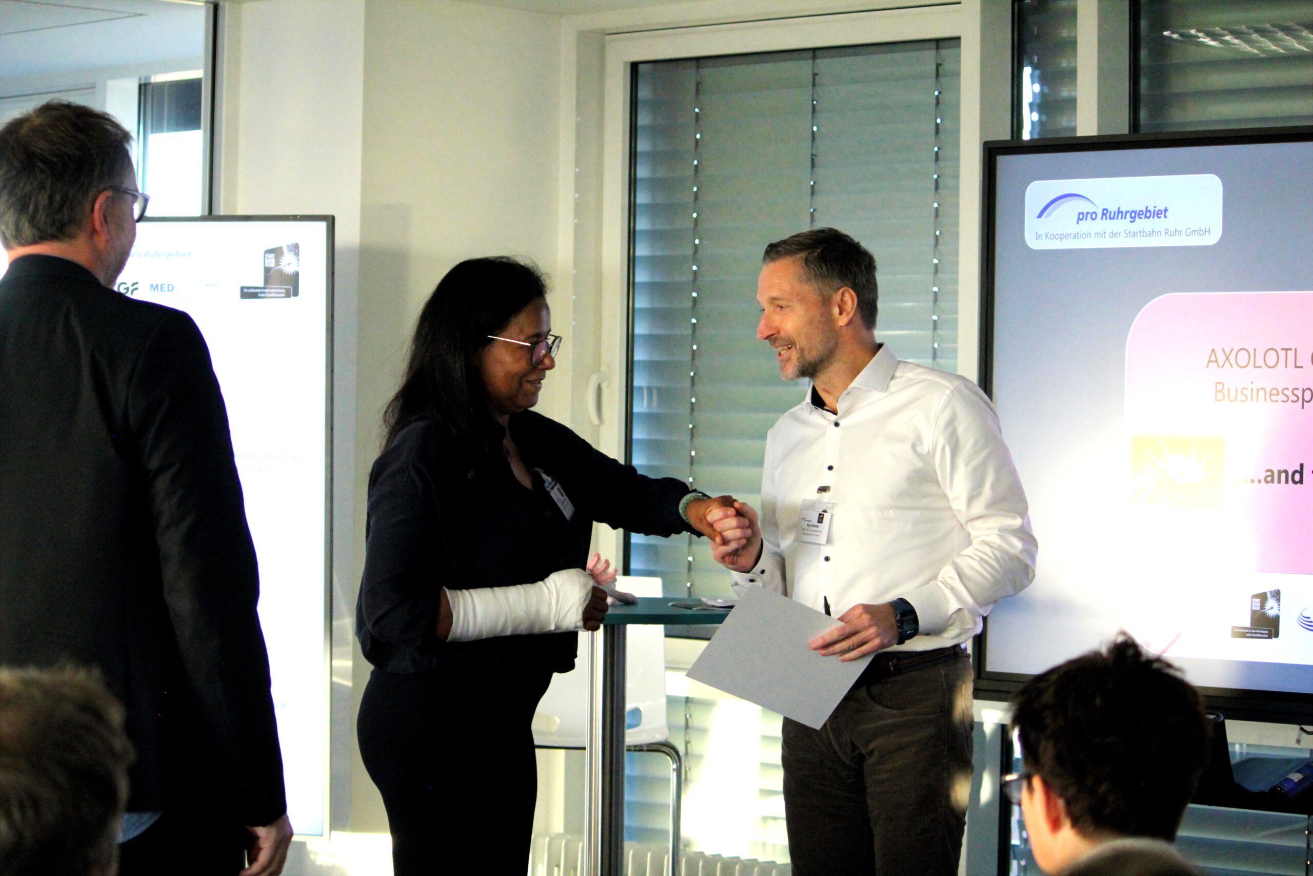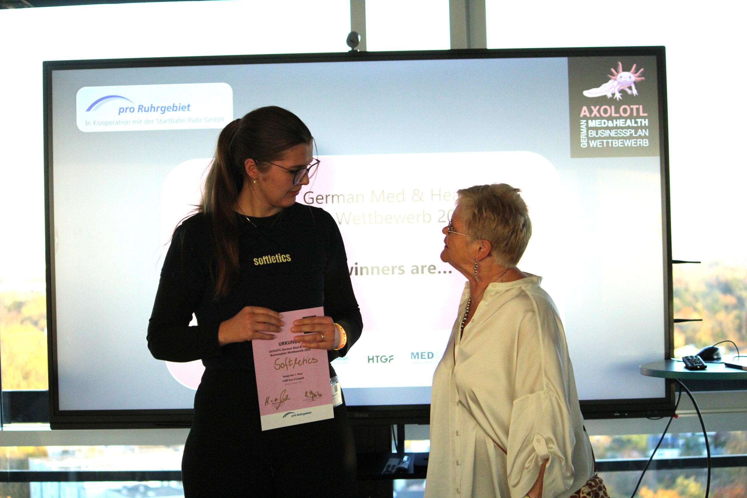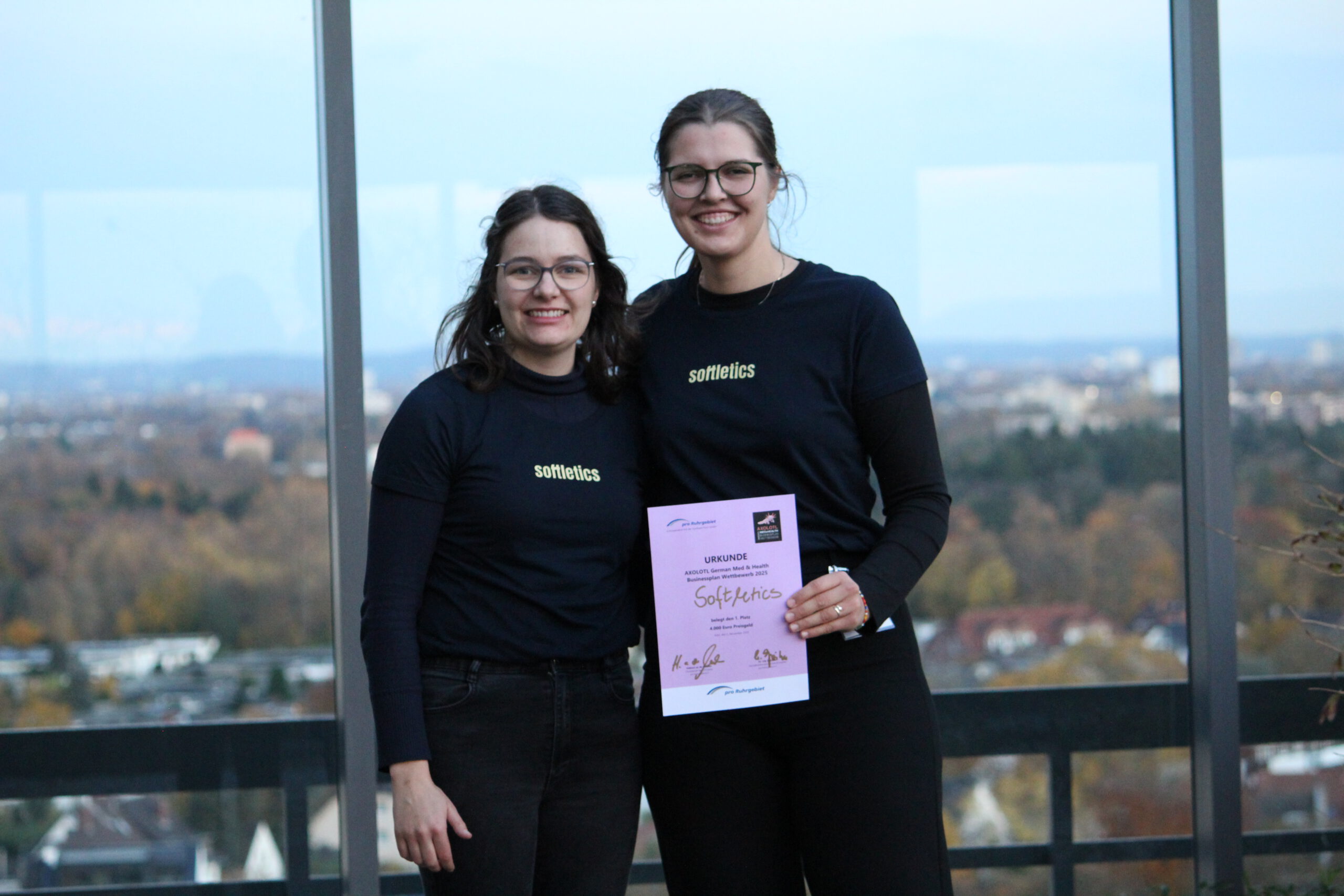 Den Wettbewerb gewinnen konnten Cara Ammann und Lisa-Marie Frühauf von Softletics (https://softletics.ch/) aus Lübeck. Das Team entwickelt und vertreibt selbstanpassbare Prothesen mit hohem Tragekomfort für aktive Menschen mit fehlenden oberen Gliedmaßen. Der erste Platz wurde von pro Ruhrgebiet e.V. mit 4.000 Euro belohnt und von Dr. Ute Günther (Geschäftsführender Vorstand pro Ruhrgebiet e.V., Vorstand Business Angels Agentur Ruhr e.V. (BAAR), Essen) überreicht.
